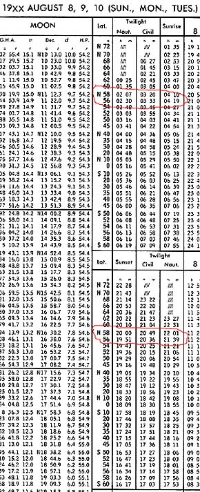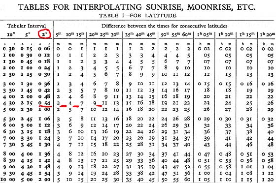 Följ raden till den lodrätta kolumn som närmast motsvarar tidskillnaden för dagsuppslagets båda närliggande tabellerade latituder, (d.v.s. tidskillnaden mellan händelsen på N56º och N58º). Här fås rättelsen som skall fogas till tiden för närmaste lägre tabellerad latitud. Den ges sådant tecken att slutvärdet faller mellan de använda tabellatitudernas värden. |