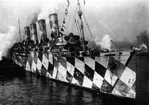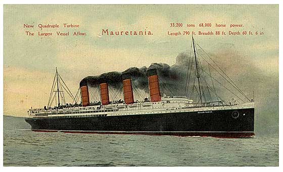 Mauretania, ett lyckligt fartygFör att kunna vinna tillbaka det blå bandet från tyskarna, tog Cunard line 1903 ett lån på 2600 000 pund från den engelska staten för att bygga systerfartygen Lusitania och Mauretania som skulle kunna komma upp i en fart på 25-26 knop. För att kunna nå dessa höga hastigheter drevs fartygen med ångturbiner. Den 20 september 1906 sjösattes det 230 m långa fartyget Mauretania. Vid första provturen nådde fartyget 26,75 knop, ett tillfredställande resultat. Tillsammans med Lusitania, som hade gett sig ut på sin jungfruresa den 7 juni, ägde Cunard de 2 snabbaste fartygen i världen. Mauretania var designat för att kunna bestyckas med 12 snabbskjutande 6 tums kanoner. |