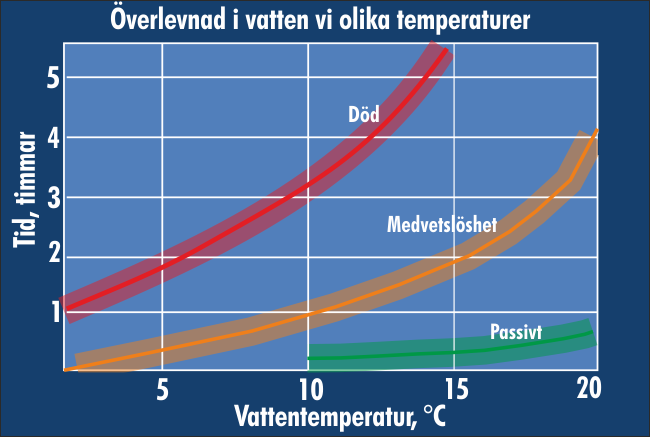 PIV - person i vattnetMånga som hamnar i vattnet dör av utmattning och köld. Vid våra kuster blir vattnet även på högsommaren sällan varmare än +15°. På våren är vattentemperaturen så låg att en påklädd människas överlevnadstid där är betydligt under timmen. Avklädd, vid t.ex. solbad, kan det handla om minuter. Överlevnadstiden beror bl.a. på klädsel, kondition, kroppskonstitution och beteende. Krafter och omdöme avtar mycket tidigare än vad de grovt generaliserade överlevnadskurvorna ger intryck av; muskelkramper och panik inträder snabbt. En nödställd i vattnet ska krypa ihop i fosterställning och hålla sig stilla! Rörelser kyler och i kallt vatten orkar inte ens goda simmare långt. Kläder isolerar, särskilt täta plagg såsom regnställ, varför så mycket kläder som flytvästen orkar bära rekommenderas! Mössan är mycket viktig. Skydda även händer och fötter! Flera nödställda ska hålla sig mycket tätt intill varandra. Rädda först små och klena nödställda, större klarar sig bättre. En nerkyld måste hanteras oerhört varsamt, inte själv ta aktiv del i sin räddning samt värmas upp mycket långsamt. Annars kan följden bli mycket allvarliga hjärtbesvär. Allmänt gäller att värma upp en nerkyld successivt och mycket långsamt genom att i princip gripa in så lite som möjligt. Lägg den nerkylde torrt och svalt men i vindlä. Täck med en lätt filt och låt kroppen värma upp sig själv. Undvik aktiv uppvärmning och ge aldrig massage!Ge bara varm (inte het), sockerrik dryck till en lindrigt nerkyld som själv vill och kan dricka. Är någon så nerkyld att han är trött, slö, apatisk, har frossa, kramper eller att rentav är medvetslös, är tillståndet så allvarligt att läkarhjälp är ett villkor för en lycklig utgång. |