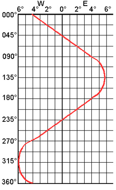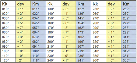 Exempel på en deviatiostabell och en deviationskurva. Tabellen är uppgjord för varje tionde grad. |