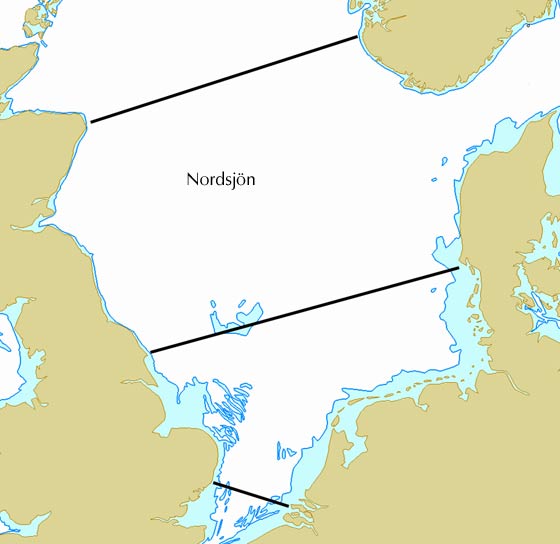 TIDVATTNET I VÅRA FARVATTENTidvattnet i Östersjön är i princip omätbart. Från nordligaste Öresund kan man svagt märka det och trots att det ökar norrut i Kattegatt blir det så marginellt att tidvattensuppgifter där knappast finns att tillgå. Även i Bälten är tidvattnet obetydligt. Dock finns här tidvattentabeller som det i viss omfattning tas hänsyn dem. Längs Norge är höjdskillnaderna obetydliga längst i syd. Från Stavanger norrut ökar de sen till omkring 3 m. Nordsjön kan ses som ett slutet innanhav avgränsat i söder av Dover Strait. Tidvattnet blir lite komplicerat eftersom en fortskridande våg rullar in mellan Skottland och Norge och återkastas av Doverområdet och kusterna i söder. Då bildas då en stående våg *med tre s.k. nodlinjer tvärs över Nordsjön. |