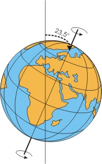 Solens deklination och timvinkelSom vi ser det, rör sig solen ett varv runt jorden på 24 timmar. På morgonen går den upp i östra horisonten och står middagstid som högst i banan - exakt i syd - för att på kvällen sjunka ner i västhorisonten. Från ena dagen till nästa är solens skenbara rörelse (eller dess projektionspunkts rörelse över jordytan) ganska långsam i vertikalledet. Det handlar bara om en kvartsgrad per dygn. Dess horisontala rörelse är betydligt snabbare. Vinkelmässigt innebär ett varv på 24 timmar att den rör sig 15°/tim eller 1°/4 min. I distans är det - vid ekvatorn - 900 M/tim eller 15 M/min eller nära 500 m/sek. En astronomisk navigatör måste bl.a. känna till himlakropparnas exakta koordinater sekund för sekund. Det gör han med hjälp av nautikalalmanackan och tabeller som idag även finns som datorprogram. Eftersom projektionspunkten rör sig över jordens yta kan åtminstone två av dessa koordinater - "latitud" och "longitud" - beräknas på denna.