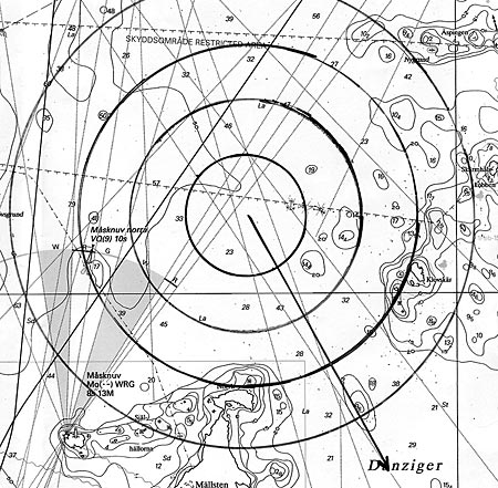 Vid stora girar, t.ex. runt uddar eller in mot ett sund, bör man helst utses den punkt där giren skall påbörjas. Att börja giren för sent och sen - när detta inses - gira okontrollerat, är ett vanligt fel. Om giren inleds på en bestämd punkt och därefter görs med jämn girhastighet, blir giren kontrollerad. Flytta fram skivan till girpunkten strax innan du är där och gira först när radarbilden stämmer med skivbilden. Följ radarbilden med skivan under giren och kontrollera att båten håller girkurvan. Flytta fram skivan till den punkt där båten bör komma ur giren, stötta sen på rätt kurs och jämför åter radarbild med skivbild. Korrigera genast läget. Med lite vana kan detta göras direkt genom att giren stoppas tidigare eller får fortsätta några grader till. Upptäckt och identifiering av fasta objekt på radarn underlättas av skivan. Deras riktning och förhållande till en viss avståndsring framgår ju av skivbilden. Detta är särskilt användbart när radarbilden är svårtolkad p.g.a. hög sjö, regn eller falska ekon. Även tidig upptäckt av svaga ekon såsom t.ex. prickar underlättas avsevärt. Man vet ju exakt var på radarbilden man skall leta. Likaså kan ekon av andra båtar lättare urskiljas från t.ex. intilliggande skär och kobbar. Om sjökortet prepareras, ökar snabbheten och säkerheten vid skivnavigering. Anteckna kompasskurser, lägg ut lämpliga girpunkter och markera tydligare vissa väl synliga ekon - t.ex. små kobbar - som syns dåligt i sjökortet. Man bör helst radarnavigera i en farled med full optisk sikt innan man går den i dimma. Att med skivan teoretiskt radarnavigera i en farled innan färden är också en god idé. |