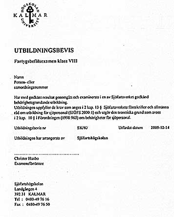 utbildningsbevis för Fartygsbefäl klass 8. Därmed