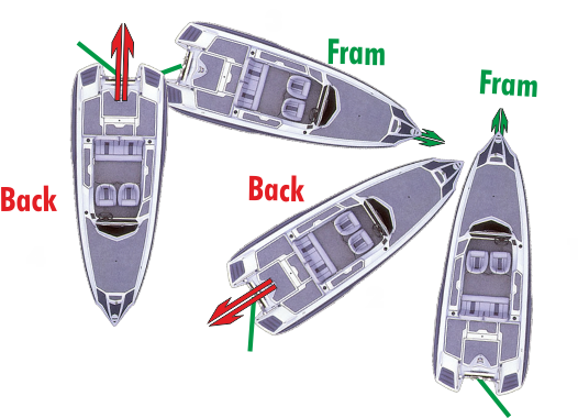 Högergängad propeller. Propellerns vridande verkan kan utnyttjas för att enkelt vända båten ett varv. Styrbords roder under hela manöverna och maskin kraftfullt fram och back utan att båten hinner ta upp farten. Denna manöver tar dig runt med minst möjliga arbetsinsats. |