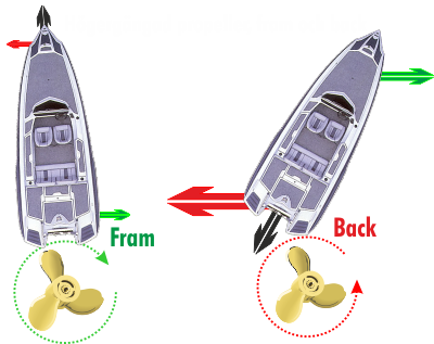 Propellern har en vridande verkan från stillastående till fram eller back. Störst är den vridande effekten vid back.